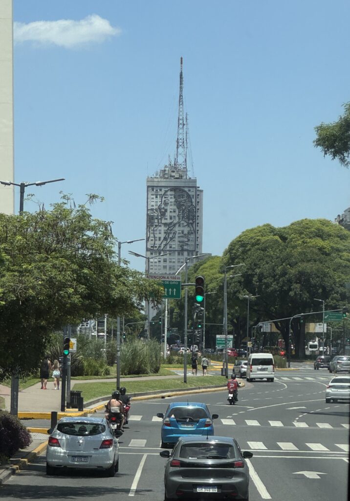 The Evita Building showing a large metal mural of Eva Peron on the facade.