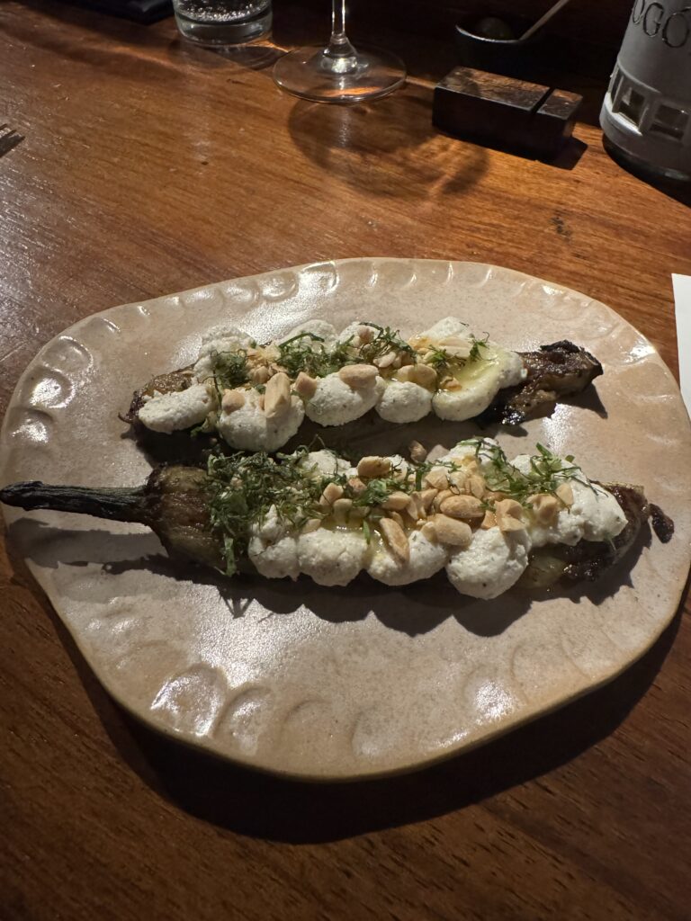 Ember-roasted eggplant with ricotta cheese and fresh herbs.
