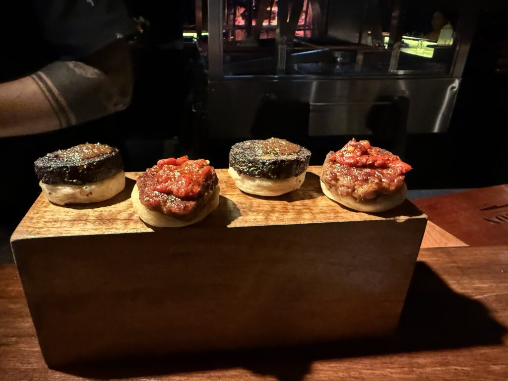 Morcilla (blood sausage)/Quince and apple chutney chorizo/ember-roasted bell pepper on griddle baked bread. I tried a teeny-tiny bite of the blood sausage, not my thing.