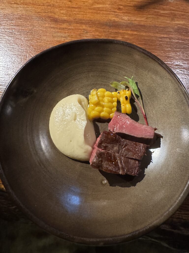 Pine cone smoked flat iron steak with creamy cauliflower puree and flame roasted corn.