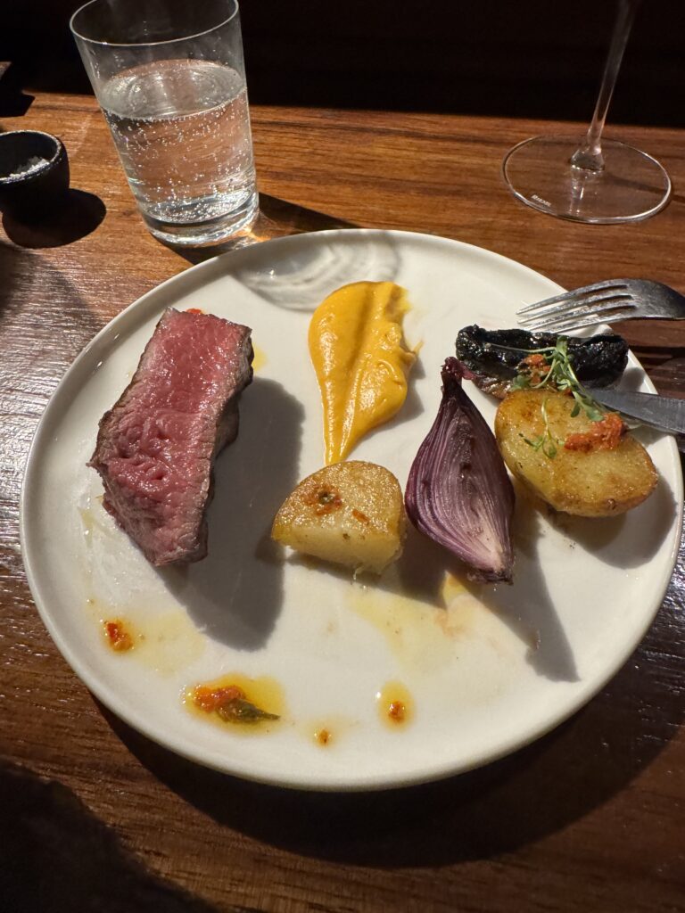 Ribeye with mashed boniatos (sweet potato) and grilled vegetables with the chef’s vinagrette.