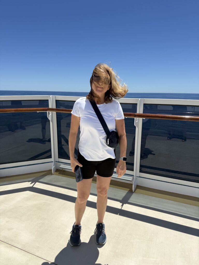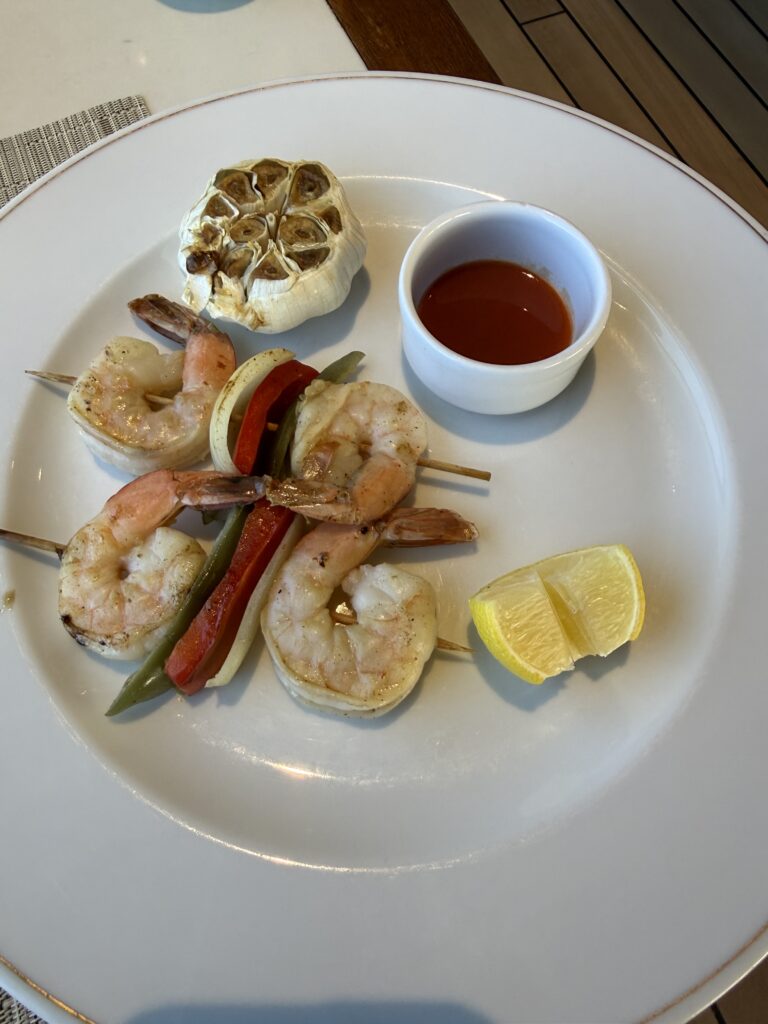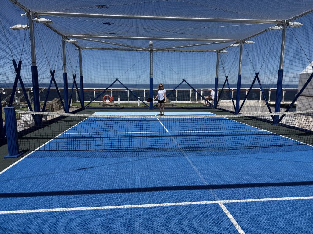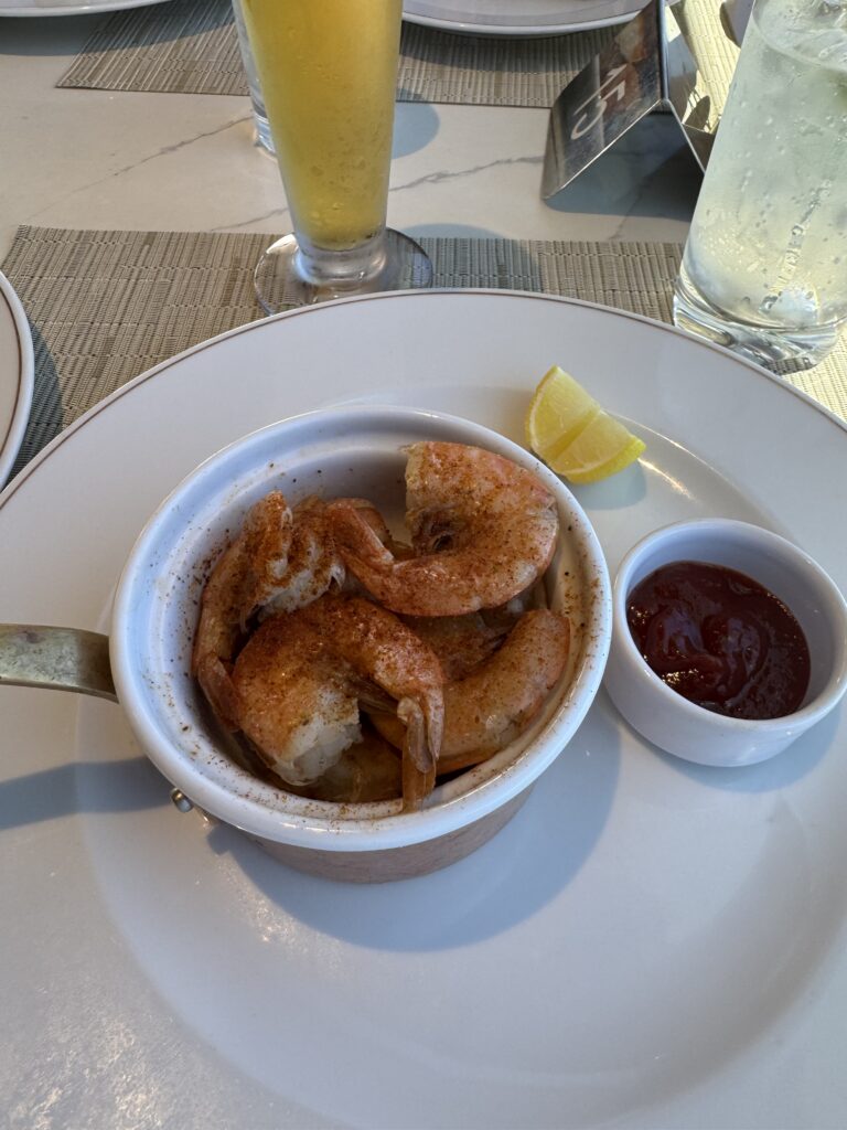 Lunch was once again at the Pool Grill. John repeated his favorite shrimp and jalapeño brochette and sampled the Tex-Mex buffet, while I went with peel-and-eat shrimp and a turkey wrap. Afterward, we wandered up to the top deck and tried out the pickle ball court. It was too windy for actual pickle balls, so we improvised with paddles and a tennis ball. Neither of us has ever played pickle ball, so it was more entertaining than skillful—but fun nonetheless!