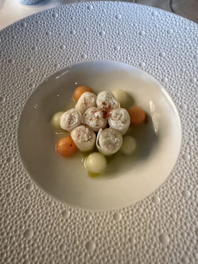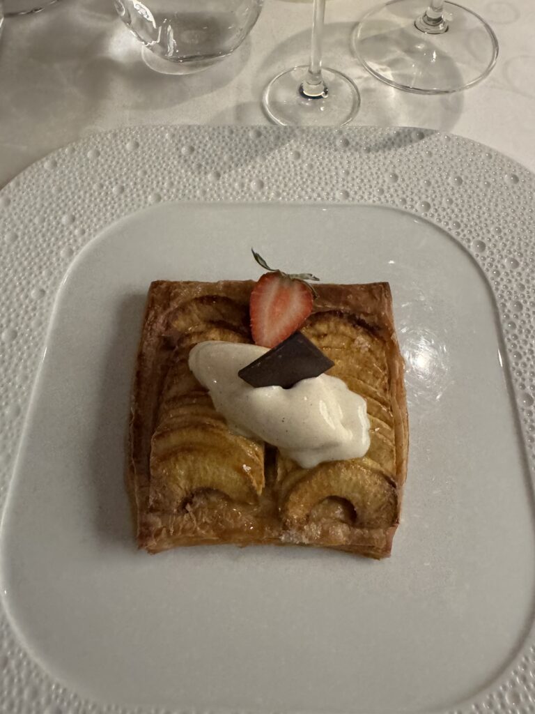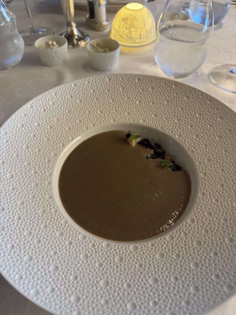 I started with the mushroom velouté with truffle and garlic confit—hands down the best I’ve ever had—followed by seared scallops with chorizo, butternut squash spaghetti, and Champigny sauce. John began with Alaskan king crab rolls served with daikon radish, chartreuse-infused melon juice, and EVOO, then also chose the scallops for his main. For dessert, we both enjoyed the crispy apple tart with vanilla ice cream, paired with a fortified wine made especially for Chartreuse. The food, service, and overall experience were exceptional.