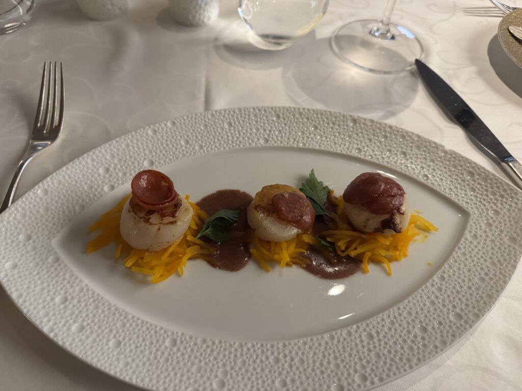 Seared scallops with chorizo, butternut squash spaghetti, and Champigny sauce