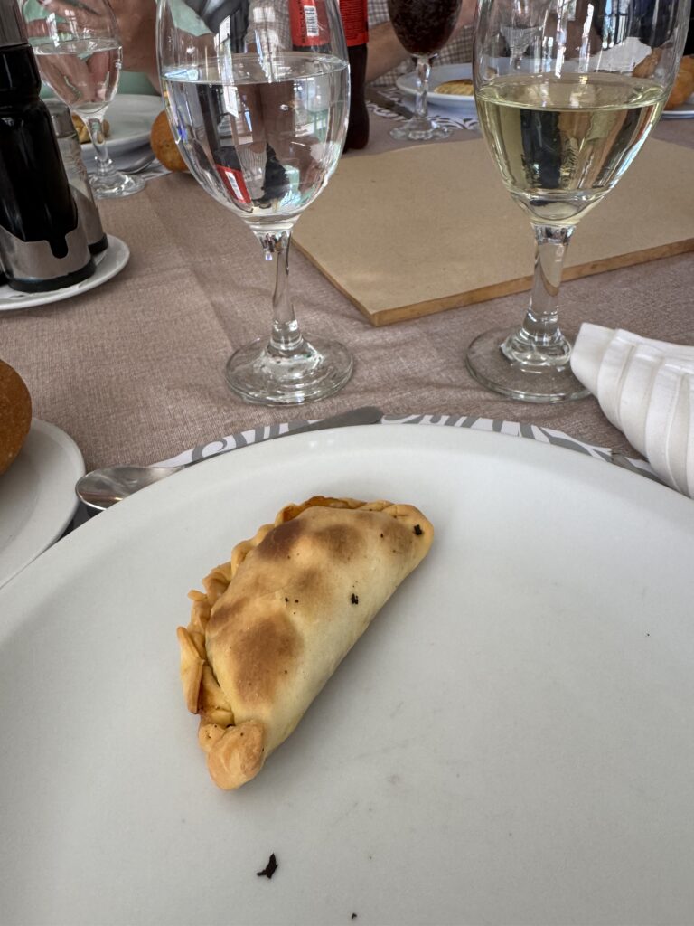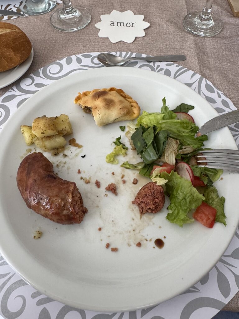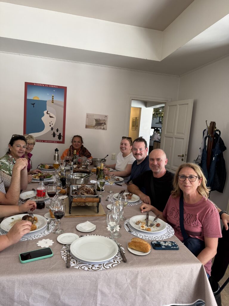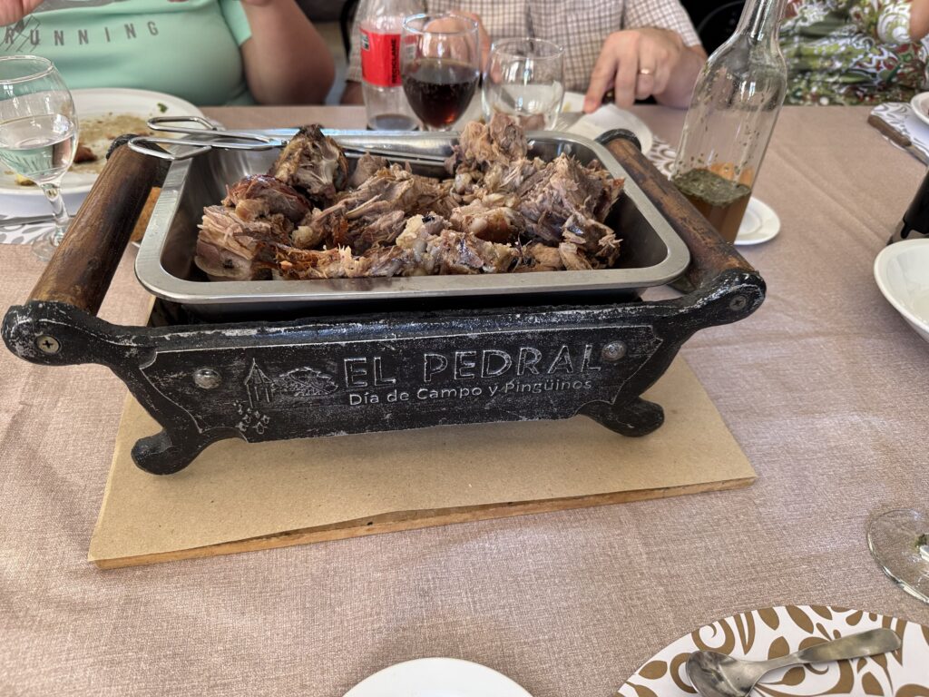 After about 30 minutes with the penguins, we headed back to the van and returned to El Pedral Lodge for lunch. The meal included empanadas, pork and beef sausage, salad, potatoes, and chopped pork—everything was delicious. Dessert was a sponge-like cake topped with a berry, something new to us and surprisingly tasty.