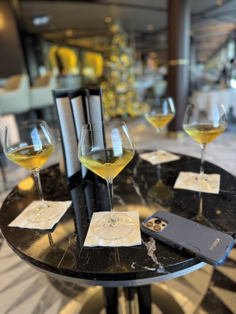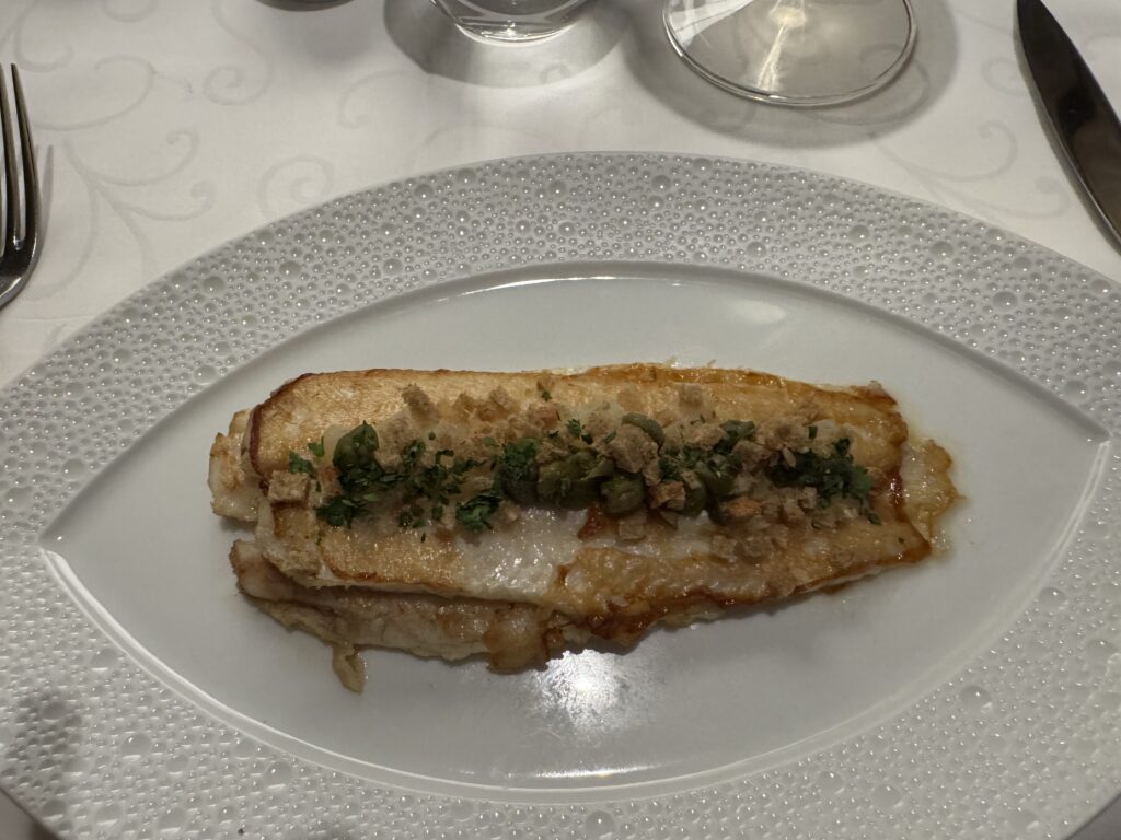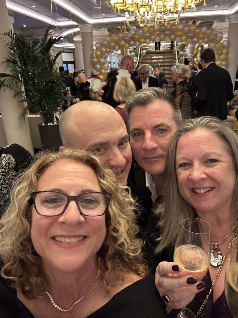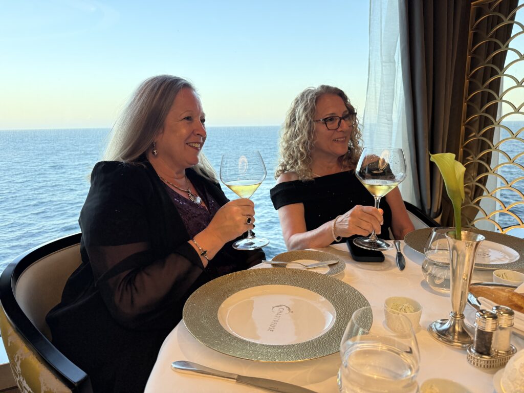 Pre-dinner drinks were in the Observation Lounge (still our favorite spot), followed by photos in our New Year’s finery. Dinner at Chartreuse was—once again—outstanding. John and I both started with beetroot salad with goat cheese cream and black truffle dressing. John followed that with lobster bisque with Armagnac. I chose Dover sole with lemon, capers, beurre meunière, and parsley potatoes. John, clearly feeling ambitious, also enjoyed baked lobster tail with scallop mousse, asparagus, almond broth, and then moved on to rack of lamb with rosemary persillade, chickpea fritters, and jus. Portion sizes are small—which I absolutely love.