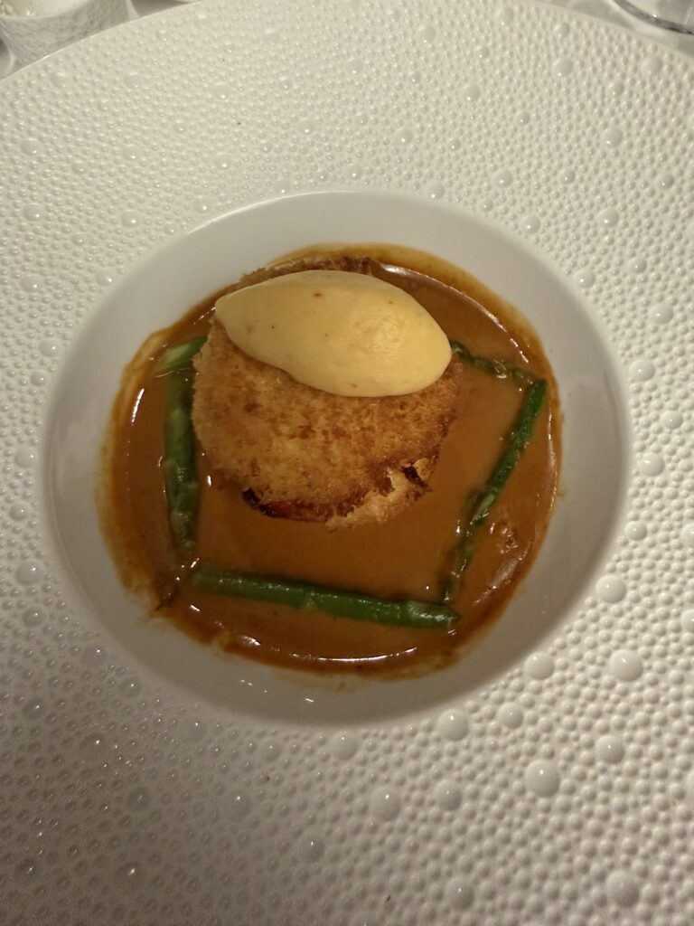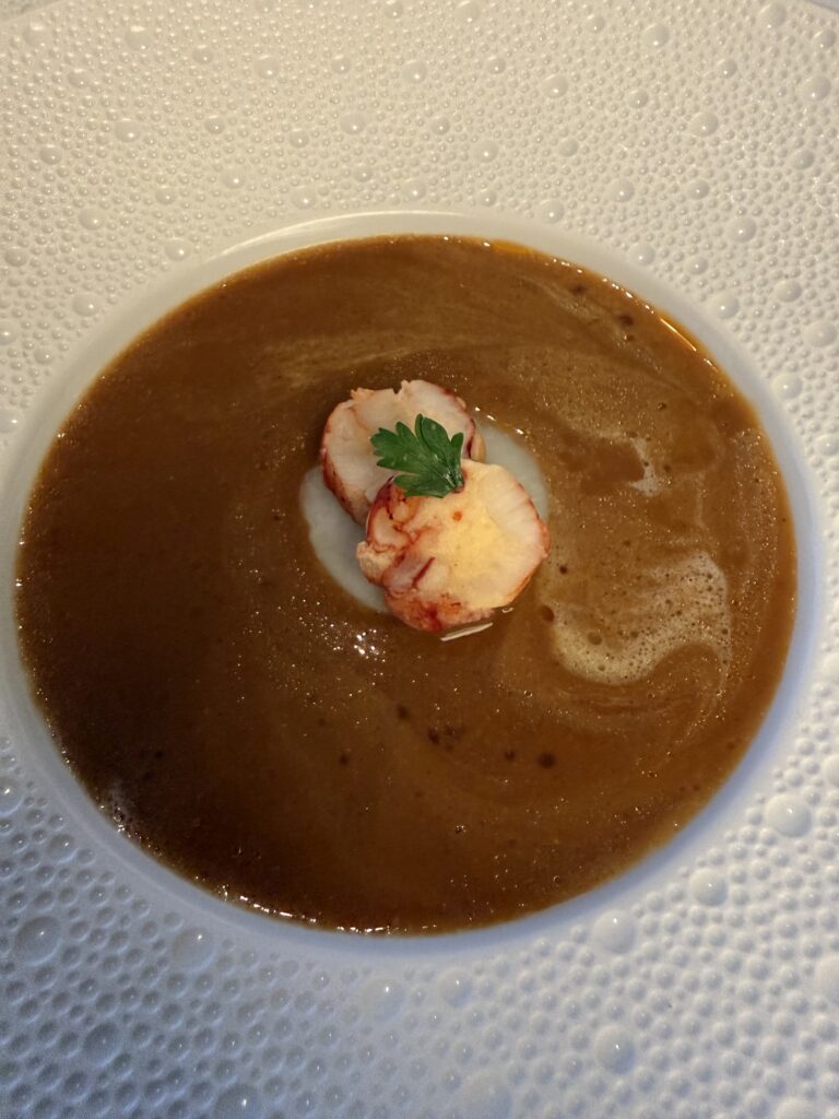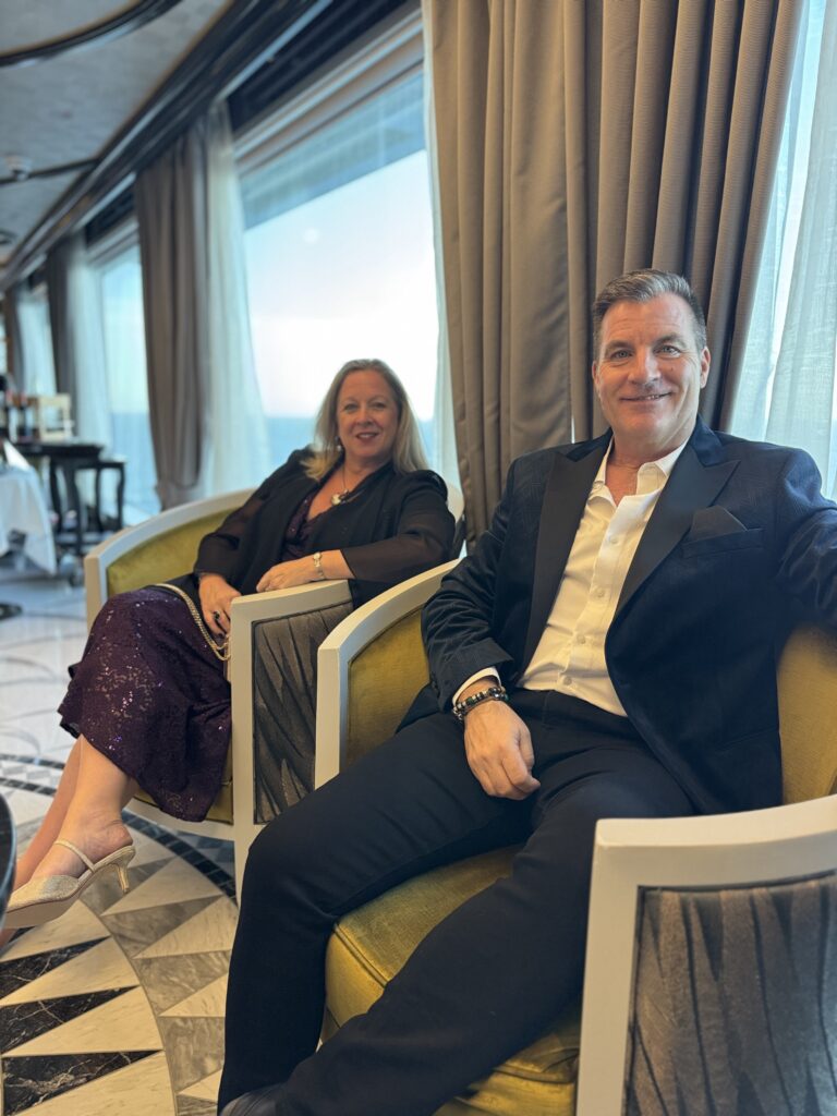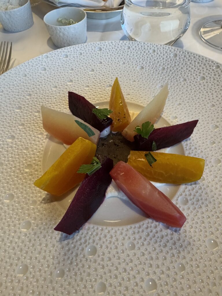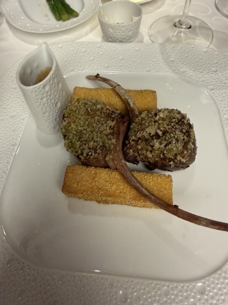 Pre-dinner drinks were in the Observation Lounge (still our favorite spot), followed by photos in our New Year’s finery. Dinner at Chartreuse was—once again—outstanding. John and I both started with beetroot salad with goat cheese cream and black truffle dressing. John followed that with lobster bisque with Armagnac. I chose Dover sole with lemon, capers, beurre meunière, and parsley potatoes. John, clearly feeling ambitious, also enjoyed baked lobster tail with scallop mousse, asparagus, almond broth, and then moved on to rack of lamb with rosemary persillade, chickpea fritters, and jus. Portion sizes are small—which I absolutely love.