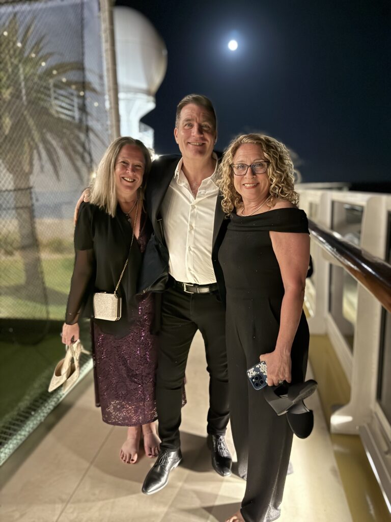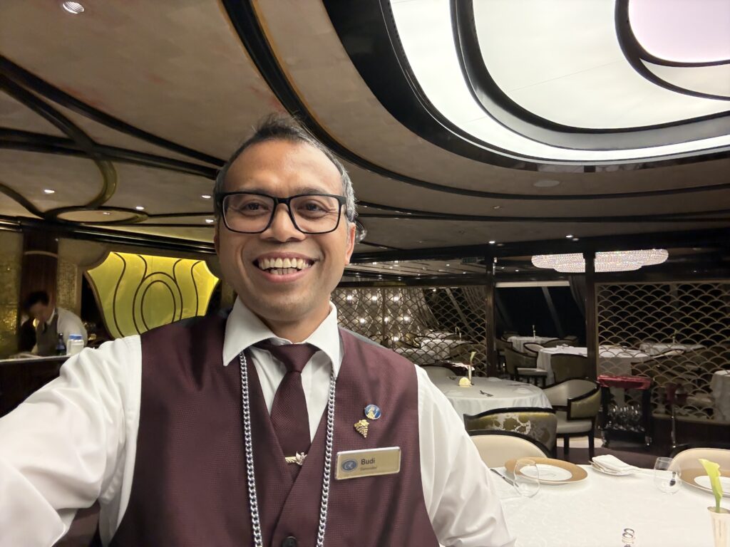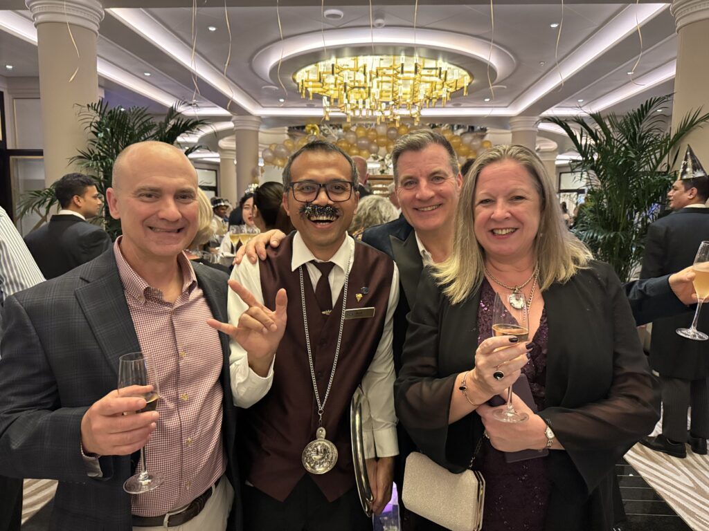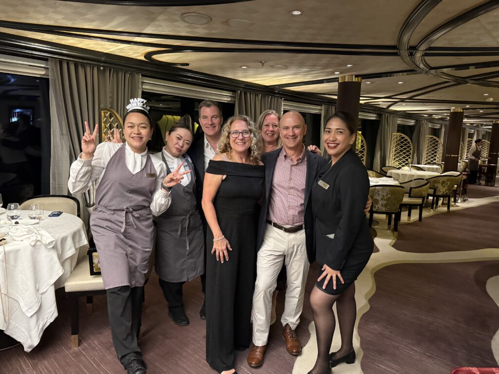 Once onboard, we grabbed espressos, showered, and met up with Catherine and Scott around 5 pm for canapés and drinks. At 6 pm, the ship’s bell rang, and everyone spilled into the hallways to toast with neighbors while waiting for the captain to come through and offer a New Year’s greeting—a really fun, communal moment.