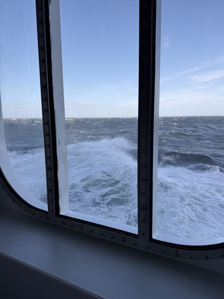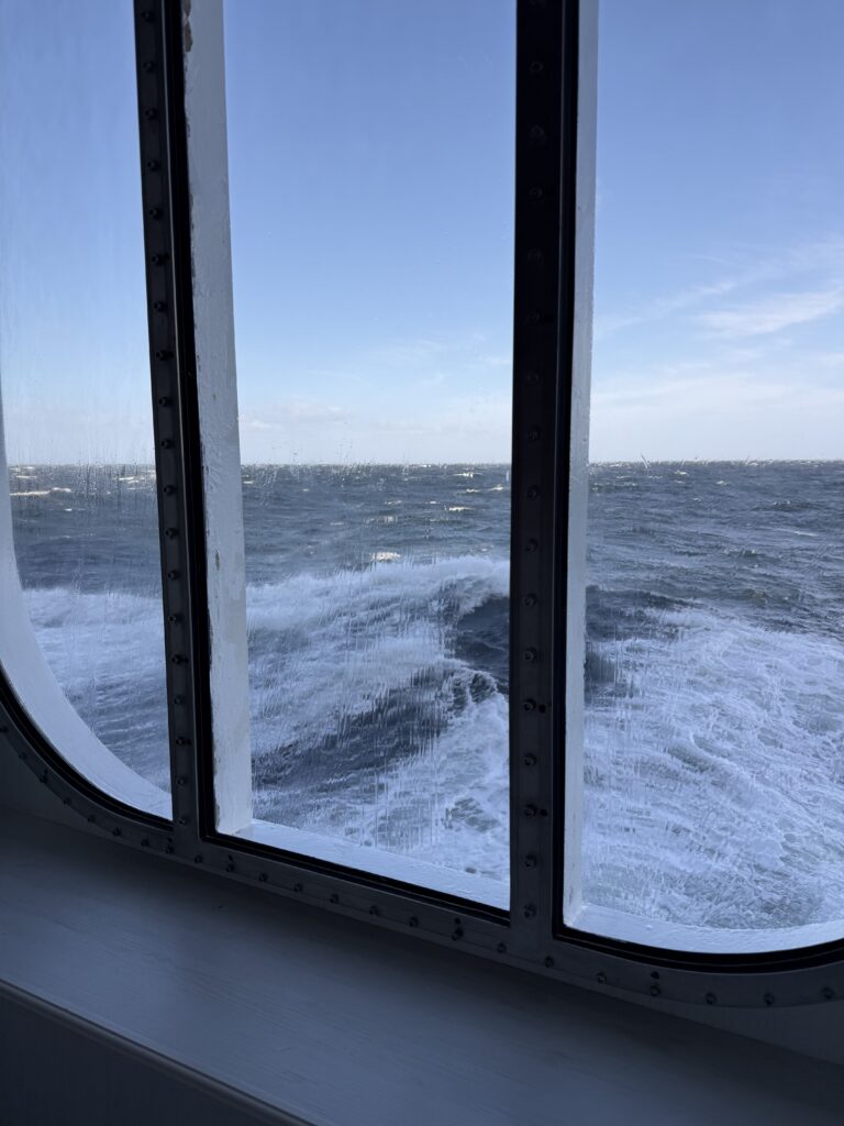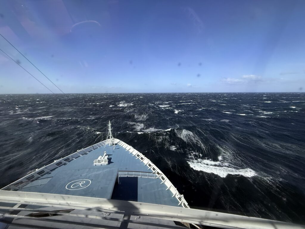 We met up with Catherine and Scott around noon for a light bite and spent some time watching the waves. The seas continued to build, but the ship’s stabilizers handled it beautifully, and honestly, we kind of enjoyed the added excitement. It’s hard not to think about Ferdinand Magellan navigating these waters in a wooden ship—now that must have been something. Thankfully, it stayed sunny most of the day, which helped a lot.