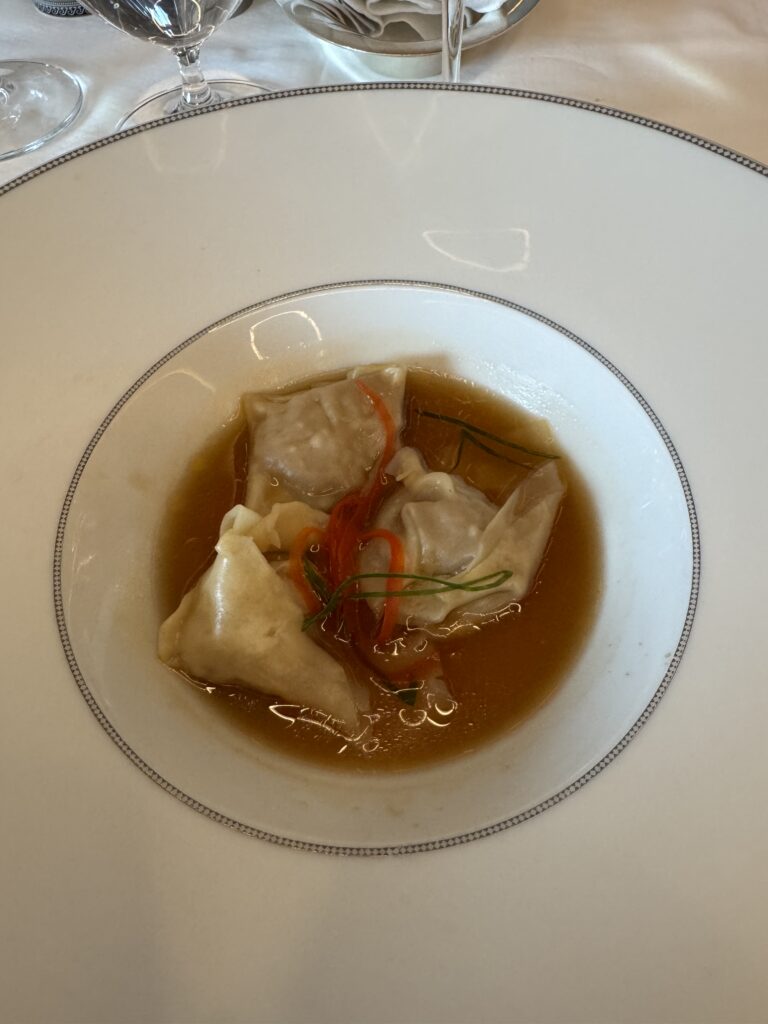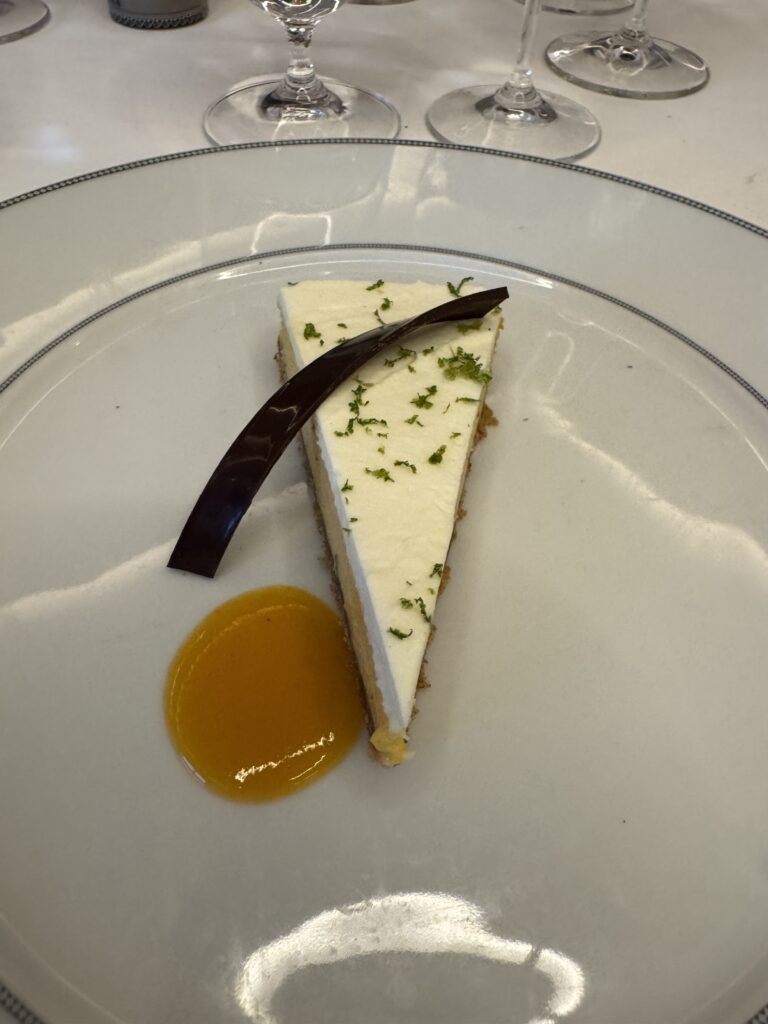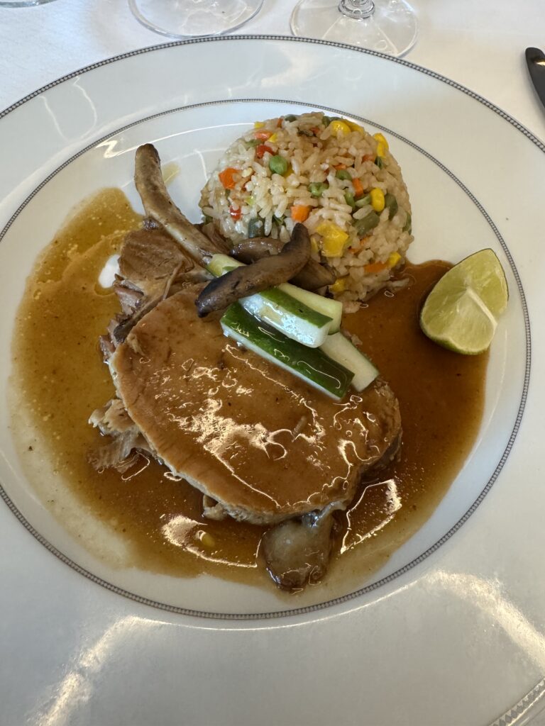 We had canapés delivered again in the evening and invited Catherine and Scott down to join us. From there, we all headed to the Observation Lounge for pre-dinner drinks before making our way to Compass Rose for dinner. I started with dumplings, followed by pork roast, and finished with a slice of Key lime pie.