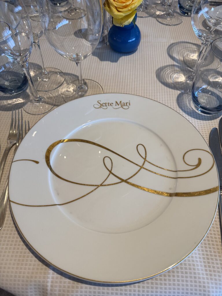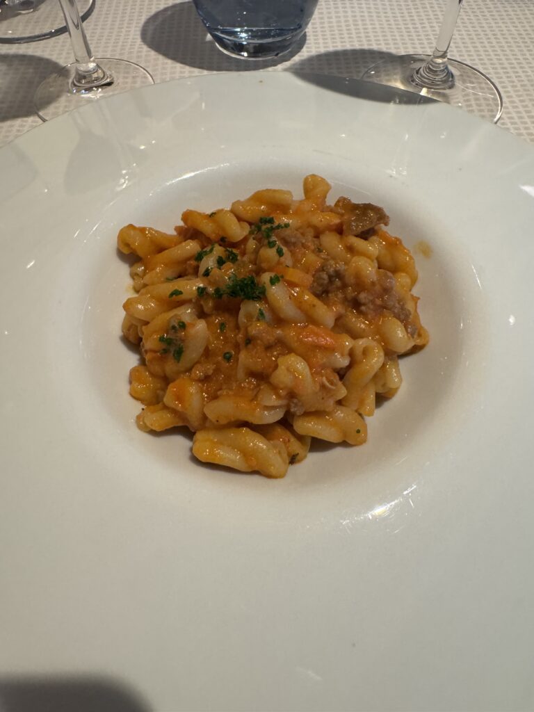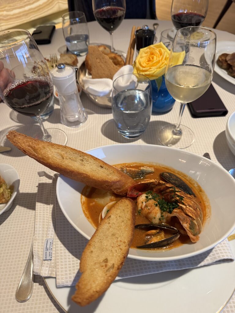 Dinner that evening was at Sette Mari in La Veranda, the ship’s Italian restaurant. We were welcomed with a small sampling of all the antipasti on the menu—a great way to start. I ordered the Cavatelli Michelangelo (small shell pasta with creamy veal Bolognese and porcini mushrooms), followed by Cioppino, a classic seafood stew in tomato and lobster broth with garlic crostini. John also had the Cavatelli Michelangelo and chose Costolette d’Agnello con Carciofi—grilled lamb chops with artichoke purée, roasted potatoes, olive-cherry tomato salsa, capers, and garlic confit.